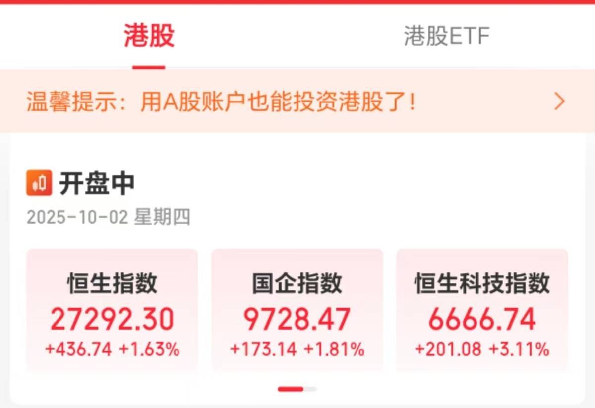 【大河财立方消息】10月2日午后,恒生科技指数上涨3%至6,659.87点。截至发稿益通网,恒生指数上涨1.63%,恒生科技指数上涨3.11%。